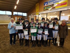 Unter den strengen Augen der Prüfungskommission – gebildet von Heike Petersen und Edith Schless-Störtenbecker – freuten sich die elf Bewerber über eine erfolgreiche Prüfung. Die beiden Richterinnen zeigten sich sehr zufrieden mit den gezeigten Leistungen. Bevor das Reitabzeichen Klasse 5 in Angriff genommen werden kann, muss zunächst der „Basispass Pferdekunde“ bestanden werden. Hier erhielten folgende Teilnehmer Urkunde und Anstecknadel: Kristoff Braunert, Julia und Stephanie Franke, Johanna Hofschulte, Tomma Thiesen und Charlotte Witt. Diese sechs Reiter und dazu Kim Doormann und Alexandra Ohrtmann bestanden dann auch das Reitabzeichen Klasse 5, welches als Einstig in den Turniersport dient. Etwas höher sind die Anforderungen für das Reitabzeichen Klasse 4. Diese berechtigt zum Start in Prüfungen der Klassen A und L. Lea Adler, Rebecca Kraus und Laura Koller erfüllten mit guten Leistungen die Bedingungen.
