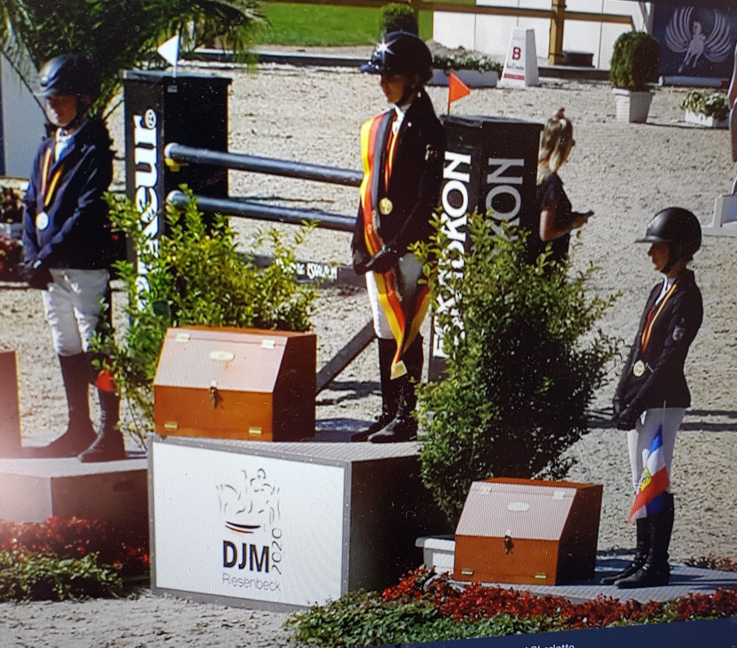(hk/me) Freya Sophie Langhans krönte ihre Children-Zeit mit dem Gewinn der Bronzemedaille bei den Deutschen Jugendmeisterschaften in Riesenbeck. Die 14-jährige Springreiterin und ihr „Curt“ starteten mit zwei fehlerfreien Runden auf 1,30m-Niveau in den ersten beiden Wertungsprüfungen. Damit belegte das Paar die Ränge neun und zwölf. Das Finale führte über zwei Umläufe. In der ersten Runde blieb das Paar fehlerfrei. Im 2.Umlauf gab es einen Abwurf. Da auch alle anderen fünf Medaillenkandidaten einen „Klotz“ in Kauf nehmen mussten, kam es zu einem Stechen um Gold, Silber und Bronze. Hier konnte sich Freya Sophie mit einer weiteren fehlfreien Runde Bronze sichern. Dies war sicherlich der Höhepunkt ihrer bisherigen Laufbahn.