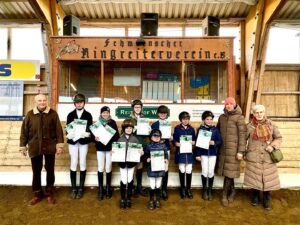 (8.1.2024 j.k.) Der winterlichen Kälte trotzend, traten am ersten Sonntag des neuen Jahres die sportlich ambitionierten Nachwuchsreiterinnen in der Volksbank Reithalle in Burg zu den FN Reitabzeichen Prüfungen an. Zunächst konnte vor den Richtern Heike Petersen und Hans-Wilhelm Seemann der Pferdeführerschein Umgang abgelegt werden. Dann ging es weiter mit den Leistungsabzeichen. Diese sind Voraussetzung, um die Leistungsklasse sechs bzw. fünf der Deutschen Reiterlichen Vereinigung zu erhalten, um dann auf Turnieren im A bzw. L Bereich starten zu dürfen. Nach einer Dressuraufgabe, Theorie und einem Standardparcours bestanden alle angetretenen Teilnehmerinnen. Zuvor hatten diese einen intensiven mehrtägigen Lehrgang in der Volksbank Reithalle absolviert und sich mit den Trainern Julia Marrancone (Dressur) und Hinerk Köhlbrandt (Springen) bestens auf die Anforderungen vorbereitet.